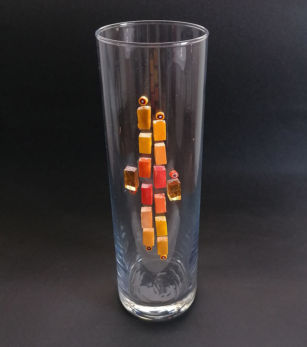 In transpare glass. With applied Murano glass mosaics, and Murano glass beads, and Murano glass murrine.